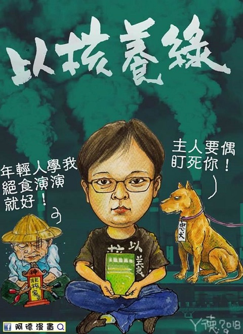 “阿德漫畫”在臉書粉絲專頁上PO出一張圖,畫出黃士修在“中選會(huì)”前絕食靜坐抗議的樣子,支持道:“感謝你的努力和付出,但身體要顧啊!留得青山在,對(duì)抗惡魔黨……”阿德漫畫還在圖中的黃士修的身旁加上“假圣人”說“年輕人學(xué)我絕食演演就好”與“真英犬”說“主人要我盯死你”,讓嘲諷之意更加完整。