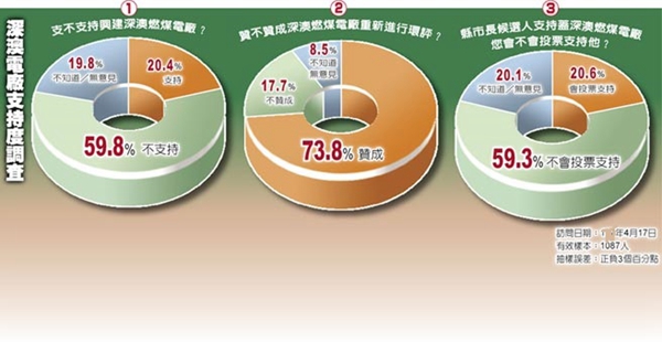 有意思的是,在被問(wèn)到年底選舉將至,如果縣市長(zhǎng)候選人支持深澳電廠,會(huì)不會(huì)投票給他?近59.3%的人表態(tài)不支持,其中有77.4%的泛藍(lán)選民表示不會(huì)投給支持深澳的候選人,泛綠選民也高達(dá)43.9%;至于沒(méi)有藍(lán)綠傾向的選民,也有53.5%不會(huì)投給支持深澳電廠的候選人。