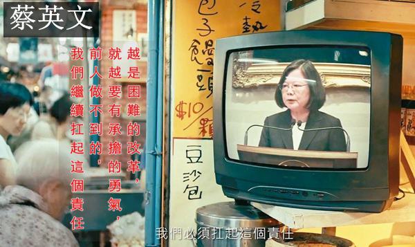 這廣告的內容很簡單明了:30秒內依序播出了臺灣地區前領導人陳水扁、馬英九和現任蔡英文對于“年金改革”的發言,最后以旁白強調“改革大家都說過,但只有我們(蔡當局)真正做到了”!如此對比就凸顯出了“以蔡英文為首的民進黨是一個有承擔、可信賴的政黨,不會辜負人民期望”這么個事兒……