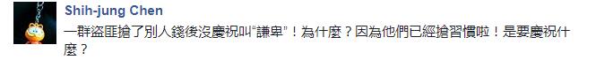 詩人渡也則發文稱,公敎人員大多是溫良恭儉讓者,而蔡英文、賴神絕對不是!兩個違規搶人民財產者卻大言不慚地表示“我們沒慶祝,很客氣了,不然要怎樣”,難道他們兩位希望退休軍公敎人員向他們致謝道歉嗎?直言這是“得了便宜還賣乖!什么叫欺人太甚?這就是了”