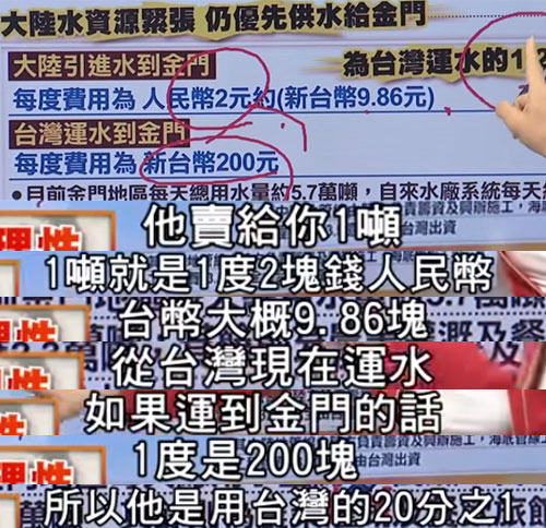 提到民生,水價自然是老百姓最關心的問題。據悉,從福建到金門,大陸方面向臺灣民眾收取的費用為9.86元(新臺幣,下同)一噸,而從臺灣運輸到金門,費用為200元一噸,換句話說,大陸收取的水費只占臺灣的二十分之一,孰優孰劣,高下立判。