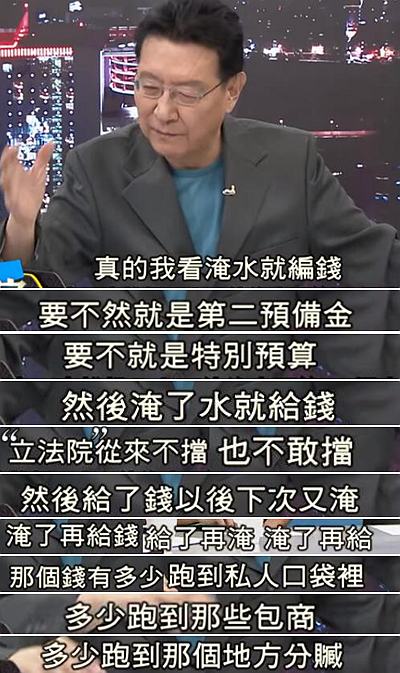 民進(jìn)黨大張旗鼓的撒大錢“治水”,如今卻被老天爺狠狠打臉,政論節(jié)目主持人趙少康表示,臺(tái)當(dāng)局“看到淹水就編錢,給了錢又淹,淹了又給”,質(zhì)疑“那個(gè)錢到底有多少跑到了私人口袋里”?