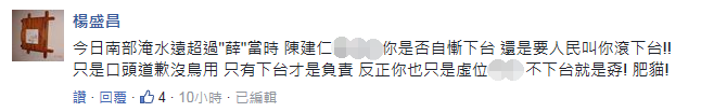 而以民進黨一貫的作風,在出了事之后,也絕不會這么輕易認輸投降。果不其然,就在昨天,陳建仁于臉譜網貼文致歉,還提到自己沒有防災職權,以求避免跟當年薛香川同樣的下場。可惜的是,網友對此并不買賬,甚至紛紛吐槽“這種行徑很惡劣你知道嗎?”“以前罵別人罵得很過癮,現在是現世報!”