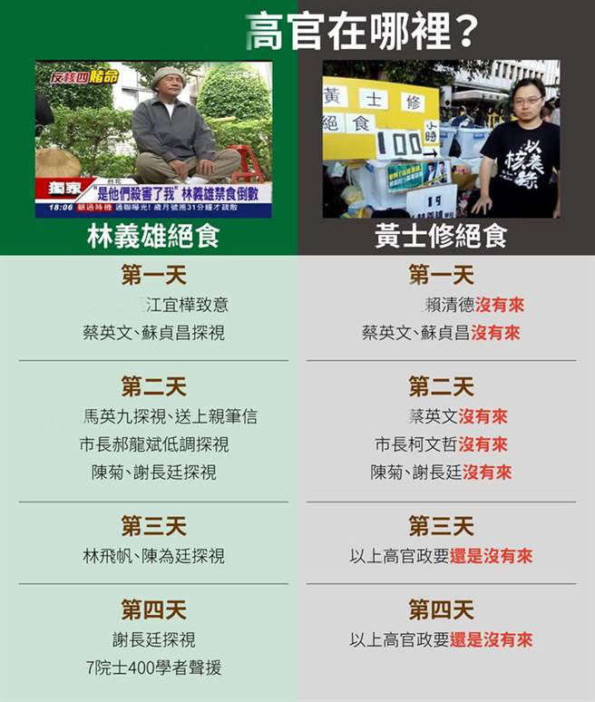 臺灣學者表示,看完這張圖才深深感受到“身份”的重要。這兩個人都為自己所相信的價值而絕食,但民進黨這位只要表態一下,禁食幾個小時,整個社會好像就沸騰起來,然后無限神圣化他的訴求,比之為“圣人”。