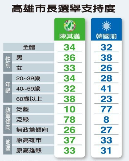 《聯合報》的最新調查發現,高雄市選情五五波,民進黨參選人陳其邁獲得34%選民支持,32%選民則力挺國民黨參選人韓國瑜,選戰陷入膠著,進入到所謂的黃金交叉范圍內,韓國瑜未來的漲勢可能比陳其邁更強勁。
