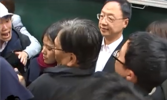這些抗議者情緒激動,高呼“不要臉!”,將江宜樺圍在中間,不許他說話,不許他在黑板上寫字,不許他留在講臺,又不許他走!看一下當時的混亂畫面: