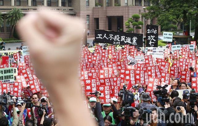 島內勞團9日上午號召各工會數百人集結在臺當局行政管理機構前抗議。(圖片來源:臺灣《聯合報》)