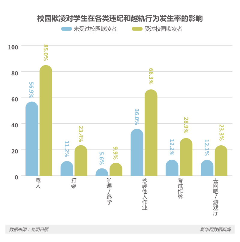 除了對心理健康水平的影響之外,校園欺凌也會使受害的學生由于受到暴力傷害的投射反應,出現各種違紀和越軌行為,甚至反過來去欺凌其他弱小的同學。在各類違紀和越軌行為中,遭受過校園欺凌的學生的發(fā)生率都差不多比沒有受過校園欺凌的學生高一倍以上。