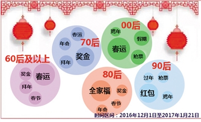 不同群體,對于“中國年”有著不同期盼。人民網輿情監測室的數據統計顯示,00后、60后最關注春運如何回家,90后最多的注意力在搶紅包,晉升為家庭主要支柱的80后們則更愿意攜帶一家老小通過全家福記錄下溫馨的春節時光,70后更關注一年辛苦得來的獎金……這一組涵蓋各個年齡段人群的數據,無疑是當今中國的一個縮影,可以從中體會人群的流動、代際的更替,更可以從中勾畫出千家萬戶闔家團聚、其樂融融的年景。