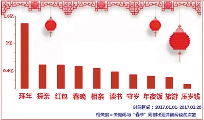 在微博空間,有關春節的何種話題互動熱度較高?打開客戶端,用戶傾向于瀏覽哪些題材的春節新聞?逛淘寶店鋪,哪些是成交量排名靠前的“年貨爆款”?“年年歲歲花相似,歲歲年年人不同”。雞年新春來臨之際,無論處身繁華的都市還是廣袤的鄉村,年的味道日漸濃厚。而來自網絡平臺的數據,刻錄下人們注意力分配的狀況,讓人感受到中國人“變”與“不變”的春節溫情。