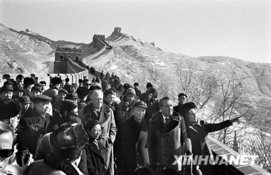 1972年2月24日,美國總統尼克松和夫人等游覽長城。新華社發
