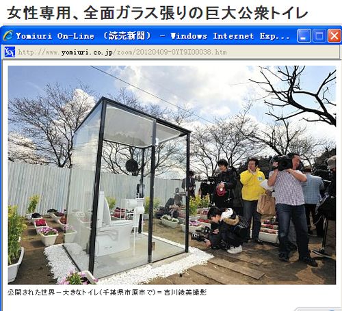 在市原市的小湊鐵道公司的飯給火車站前,有一塊用杉樹干密集圍成的、面積約200平方米的空地。如果沒人介紹,誰也想象不出,這里面竟是一個(gè)女性專用廁所。如今,人們看到,空地中央安放了一個(gè)1.4平方米的單間式廁所,廁所的墻壁全部采用通亮的玻璃。坐在里面,可以看到遍布四周的五顏六色的盆栽鮮花。而且,從外面也能一覽廁所內(nèi)部如廁人的一舉一動(dòng)。玻璃廁所的設(shè)計(jì)者藤本壯介介紹稱,建造它是“希望使用者即使是在個(gè)人的方便空間也能欣賞到美麗的風(fēng)景”。
