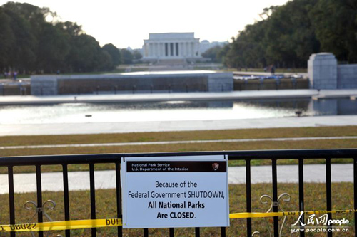 華盛頓二戰紀念園柵欄外掛出“因聯邦政府關閉,所有國家公園關門”的告示牌。后面的林肯紀念堂也因此關門。本報記者 溫憲攝