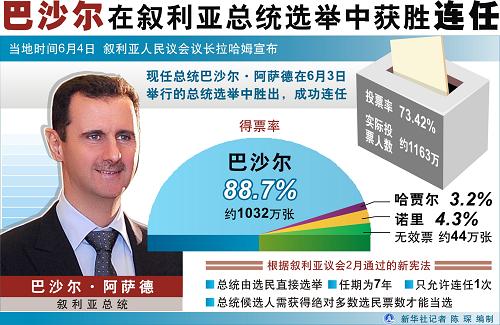 當(dāng)?shù)貢r(shí)間6月4日晚間,敘利亞官方公布了總統(tǒng)選舉結(jié)果,現(xiàn)任總統(tǒng)巴沙爾毫無懸念地高票勝出,成功連任。中國中東問題特使在接受記者專訪時(shí)說,敘利亞各方當(dāng)務(wù)之急是盡快停火止暴,重啟政治對(duì)話。