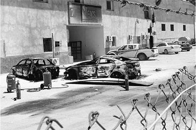 7月16日,在利比亞的黎波里,兩輛汽車在沖突中損毀。新華社發