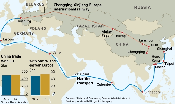 習(xí)近平提出這些雄偉構(gòu)想的一個(gè)動(dòng)機(jī)在于,他希望加強(qiáng)中國(guó)內(nèi)地、特別是西部地區(qū)與歐洲的聯(lián)系。假如這些倡議成真,那或許將相當(dāng)于自中國(guó)20年前開(kāi)始成為國(guó)際貿(mào)易的重要參與者以來(lái),全球貿(mào)易路線的一次最大洗牌。