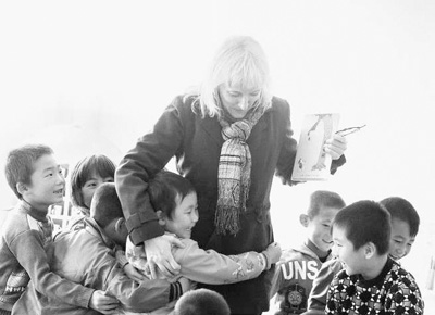2014年9月,美國人史梅淳(梅麗莎·凱·史密斯)被授予中國政府友誼獎。從1993年開始,史梅淳在寧夏大學外語系任教3年。2004年,在美國攻讀完博士學位后,她重回寧夏,其在寧夏大學任教已超過10年。圖為史梅淳在寧夏山區和孩子們交流。