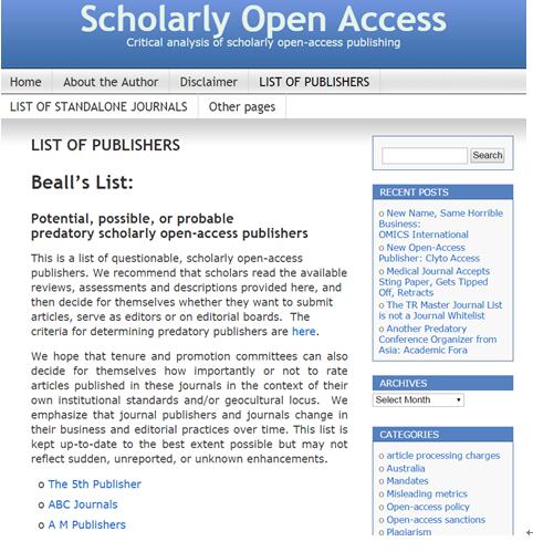 2009年開始,美國知名教授Jeffrey Beall涉足學術開放存取出版的問題研究,近年來不斷更新開放存取期刊出版社的黑名單,提醒作者謹慎投稿和參與編輯或編委。2013年10月14日更新的黑名單包括439家期刊/出版社。