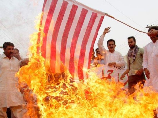 巴基斯坦民眾焚燒美國國旗,抗議美軍無人機空襲。