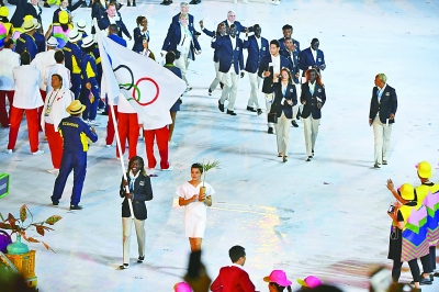 8月5日,第31屆夏季奧林匹克運動會開幕式在巴西里約熱內盧馬拉卡納體育場舉行。圖為難民奧林匹克代表團在開幕式上入場。新華社記者 呂小煒攝