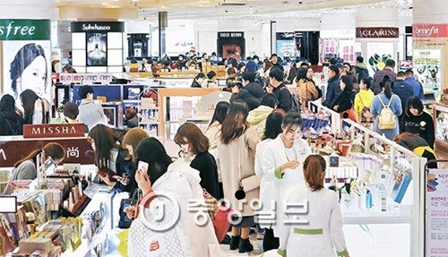 圖為1月5日,中國游客正在首爾蠶室樂天百貨店世界塔店內挑選商品。(韓國《中央日報》)