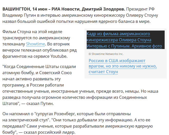 【環球網綜合報道】據俄新社6月14日報道,俄羅斯總統普京在接受美國導演奧利弗 斯通采訪時稱,破壞世界核平衡的企圖是巨大錯誤。