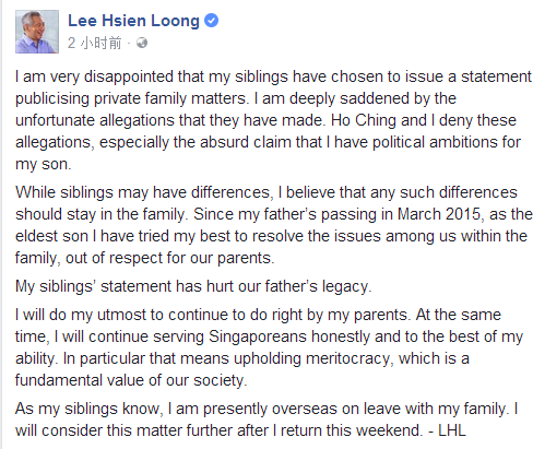 針對兩人的指控,李顯龍全然否認。他說:“兄弟姐妹之間可能存在分歧,我認為這些分歧應(yīng)該是只限在家庭里。自從我父親在 2015 年3月去世,出于對父母的尊重,身為長子,我盡一切努力處理我們家人之間的紛爭。我弟弟妹妹的公開信傷害了父親的名譽。我會繼續(xù)盡我全力無愧于父母,與此同時,也會繼續(xù)竭盡所能忠誠地為新加坡服務(wù),特別是堅持唯才是用,而這是我們社會的基本價值觀。我的弟弟妹妹們都知道我和家人在國外度假,這個周末回國后我會考慮后續(xù)的處理!