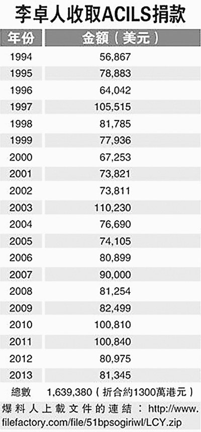 大公報文章說,香港網民“旺角腦場起底組”近日上載于網絡的大量文件揭露,李卓人所領導的“香港職工會聯盟(簡稱職工盟)”號稱政治中立組織,卻自1994年以來,每年均向美國國家民主基金會(NED)旗下的美國國際勞工團結中心(ACILS)申請5萬至10多萬美元資助,至今已接受合共多達近164萬美元,折合約1300萬港元捐款。