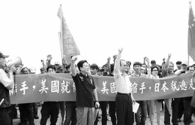 臺灣統(tǒng)派政治團體振臂高呼“兩岸齊心,保衛(wèi)釣魚島”“兩岸聯(lián)手,美國就縮手,美國一縮手,日本就逃走”。 本報記者 徐 蕾攝