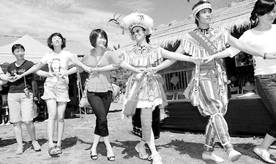 大陸游客與阿美族勇士(右二)同歡共舞,體驗阿美族文化。