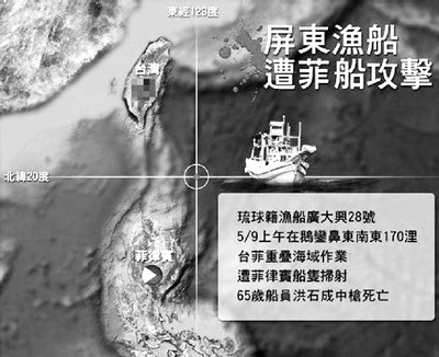 屏東小琉球籍的漁船“廣大興28號(hào)”9日在臺(tái)菲重疊經(jīng)濟(jì)海域作業(yè)時(shí),遭遇菲律賓公務(wù)船在沒有預(yù)警的情況下,以自動(dòng)武器射擊數(shù)十槍,漁民洪石成不幸身亡。臺(tái)灣當(dāng)局官員指出,臺(tái)灣漁船當(dāng)時(shí)所在位置是臺(tái)菲暫定執(zhí)法線海域內(nèi)作業(yè),是臺(tái)灣合法漁場(chǎng)。
