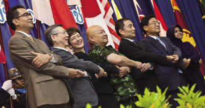2012年2月7日,泰國東部呵叻府,參加“金色眼鏡蛇-2012”軍演的7國代表在開幕式上共同攜手。圖片:美國海軍陸戰隊(U.S. Marine Corps photo by Lance Sgt. Matthew Troyer)