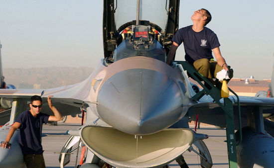 資料圖:以色列空軍地勤人員正在檢查一架F-16戰(zhàn)斗機。