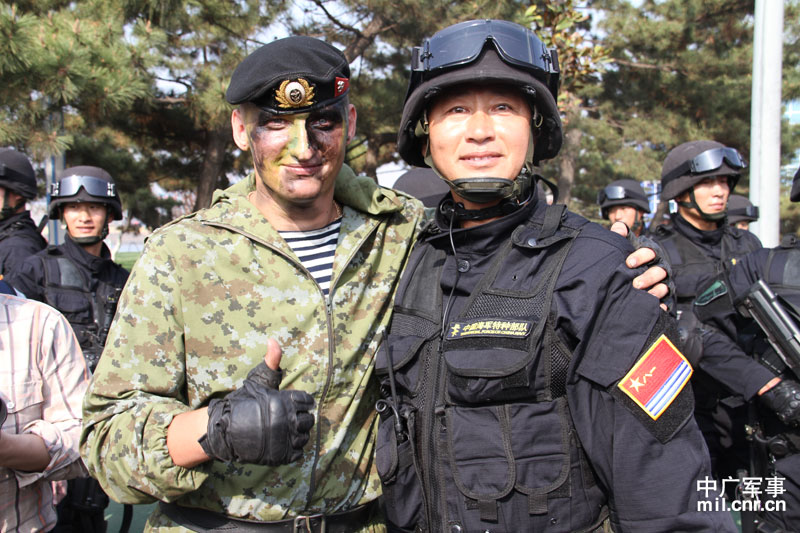 2012年4月23日下午,在俄方參演軍艦停靠的碼頭上,參加“海上聯(lián)合-2012”中俄海上聯(lián)合軍事演習(xí)的中俄雙方海軍特戰(zhàn)隊(duì)員進(jìn)行表演交流。圖為帶隊(duì)表演的中俄雙方特戰(zhàn)隊(duì)軍官。攝影:穆亮龍