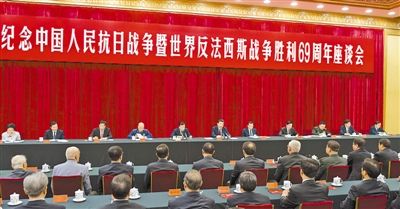 中共中央、國(guó)務(wù)院、中央軍委3日下午在人民大會(huì)堂舉行座談會(huì),紀(jì)念中國(guó)人民抗日戰(zhàn)爭(zhēng)暨世界反法西斯戰(zhàn)爭(zhēng)勝利69周年。中共中央總書(shū)記、國(guó)家主席、中央軍委主席習(xí)近平發(fā)表重要講話強(qiáng)調(diào),歷史無(wú)法重來(lái),未來(lái)可以開(kāi)創(chuàng)。站在新的歷史起點(diǎn)上,我們紀(jì)念中國(guó)人民抗日戰(zhàn)爭(zhēng)暨世界反法西斯戰(zhàn)爭(zhēng)的偉大勝利,就是要銘記歷史、警示未來(lái),動(dòng)員全黨全軍全國(guó)各族人民肩負(fù)起歷史重任,動(dòng)員全黨全軍全國(guó)各族人民更加奮發(fā)有為地為實(shí)現(xiàn)中華民族偉大復(fù)興而奮斗。