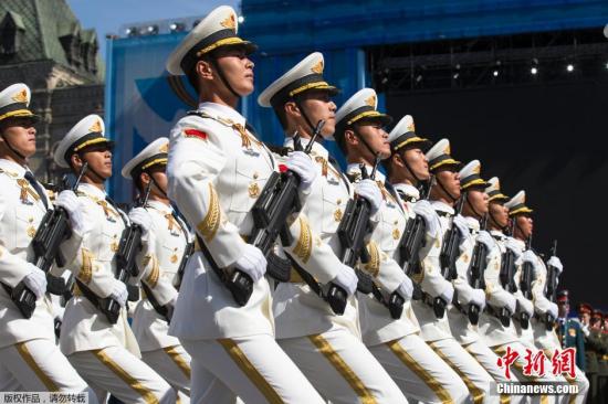 5月7日,在俄羅斯首都莫斯科,中國人民解放軍三軍儀仗隊在彩排中列隊行進。當日,俄羅斯在首都莫斯科的紅場舉行紀念衛國戰爭勝利70周年紅場閱兵式總彩排。