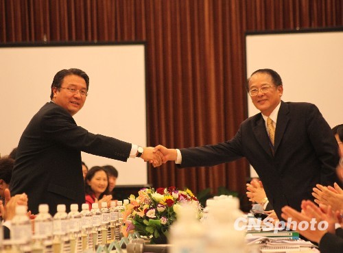 兩岸經濟合作框架協議(ECFA)第二次協商3月31日在臺灣桃園縣鴻禧大溪別館舉行。圖為會談開始時大陸方面主談代表商務部臺港澳司司長唐煒與臺灣主談代表黃志鵬(右)握手。(圖片來源:中新社)