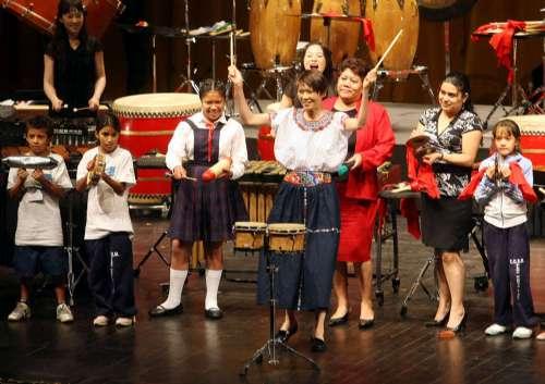 周美青(中)5月29日(當地時間)在危地馬拉國家劇院,換上當地傳統婦女服裝與小朋友同樂。(圖片來源:臺“中央社”)