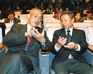 數度請辭的楊志良17日向馬英九等報告健保費率調整方案后,決定接受慰留。圖為17日上午,楊志良(右)召開記者會宣布健保費率調整方案,吳敦義(左)與他相互交換意見。(圖片來源:臺灣《聯合晚報》)