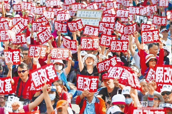 民進黨對藍營“鐵票群”“開鍘”。“軍公教”退休人員多數支持國民黨,是藍營“鐵票部隊”。為削弱國民黨支持力量,民進黨當局利用“年金改革”方案盡量削減“軍公教”人員的退休金及補貼,美其名曰縮小貧富差距,維持社會“公平正義”,這直接觸怒了“軍公教”群體。年內,“軍公教”群體已經多次舉行街頭抗議活動,此次抗爭人數更多、呼聲更強,引發島內社會波動。
