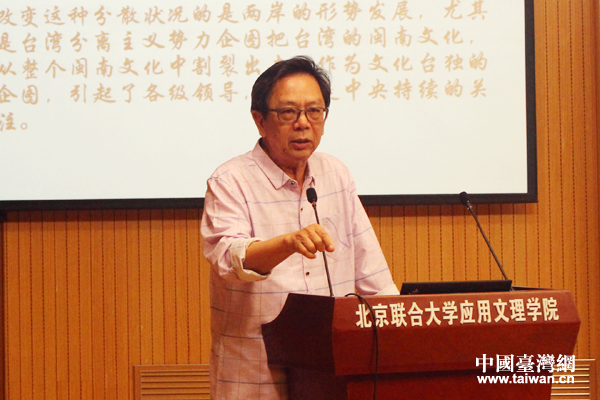 福建省廈門市閩南文化研究會會長陳耕圍繞“閩南文化研究新世紀(jì)的回顧與新時代的前瞻”進行主題發(fā)言。(中國臺灣網(wǎng) 張潔 攝)
