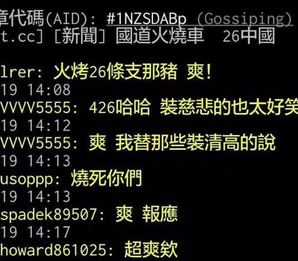更何況,24名大陸同胞在旅行車內被活活燒死——一個令人聞之落淚的人間慘劇,居然成了臺灣某些人炒作仇恨、對立和冷漠的平臺!有人說:死了26個,簡稱426,“死阿陸”,天意;有人說:火烤26條支那豬,爽!他們甚至忘了:慘死的26人中,除了24名大陸人,還有2名臺灣人!