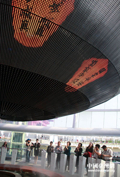 近觀臺(tái)灣館,巨大的天燈(即孔明燈)造型連接刻有如意花紋的不銹鋼山體墻面,100萬個(gè)LED燈組成的球幕透過玻璃燈罩為游客們展演臺(tái)灣豐富多元的藝術(shù)影像。炫目的光影效果吸引諸多游客在臺(tái)灣館前流連,而臺(tái)灣館的出色只有走進(jìn)這盞“天燈”,才能真正的體會(huì)。