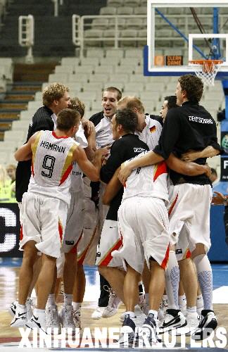 7月20日,德國(guó)隊(duì)隊(duì)員慶祝勝利。當(dāng)日,在希臘雅典進(jìn)行的北京奧運(yùn)會(huì)男籃資格賽爭(zhēng)奪第三名的比賽中,德國(guó)隊(duì)以96比82戰(zhàn)勝波多黎各隊(duì),獲得北京奧運(yùn)會(huì)的參賽資格。 新華社/路透