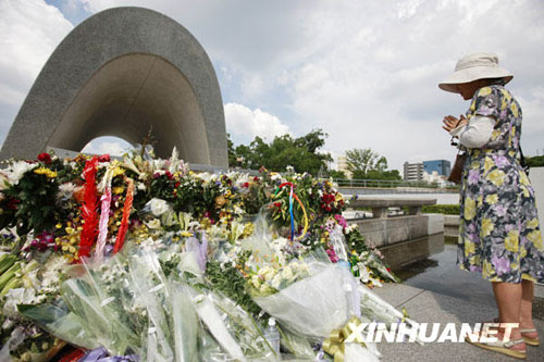 8月5日,在日本廣島和平紀念公園,一位女士站在原子彈爆炸死難者紀念碑前,悼念死去的親屬。新華社記者任正來攝