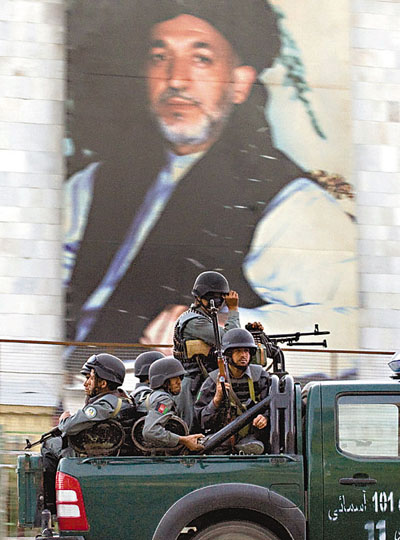 一隊武裝警察巡邏經過現任總統卡爾扎伊的選舉海報