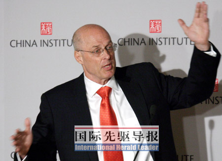 11月8日,美國財政部長保爾森在紐約舉行的“第四屆華美協進社企業家高峰會議”上就中美戰略經濟對話的進展發表講話。 本報記者 侯俊/攝