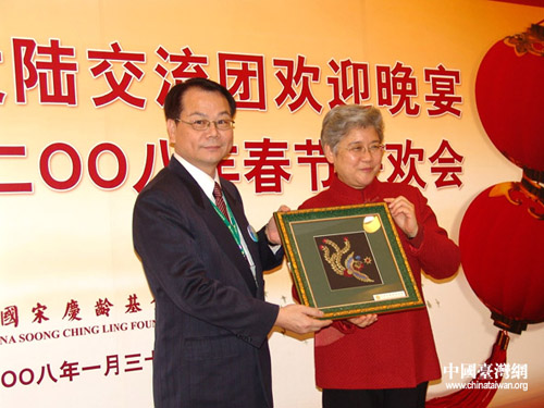 中國宋慶齡基金會副會長唐聞生(右)與交流團團團長臺灣十大杰出青年基金會監察人陳建騏先生互換禮品