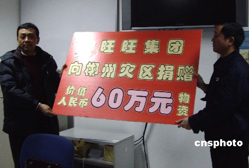 中新社長沙二月十四日電 (記者 傅煜)臺企旺旺集團今日向湖南郴州災區捐贈了價值六十萬元人民幣的救災物質,支援當地災后重建。