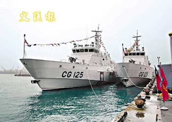 “海巡署”兩艘新巡防艦中機隊的金門艦、北機隊的連江艦24日上午在高雄港旗津第五海巡隊碼頭成軍,據稱,主持成軍典禮的陳水扁十分贊賞兩艦的性能,尤其是將推進系統由傳統的螺槳式改為新型噴水式,創下臺灣大型艦艇造船的首例。